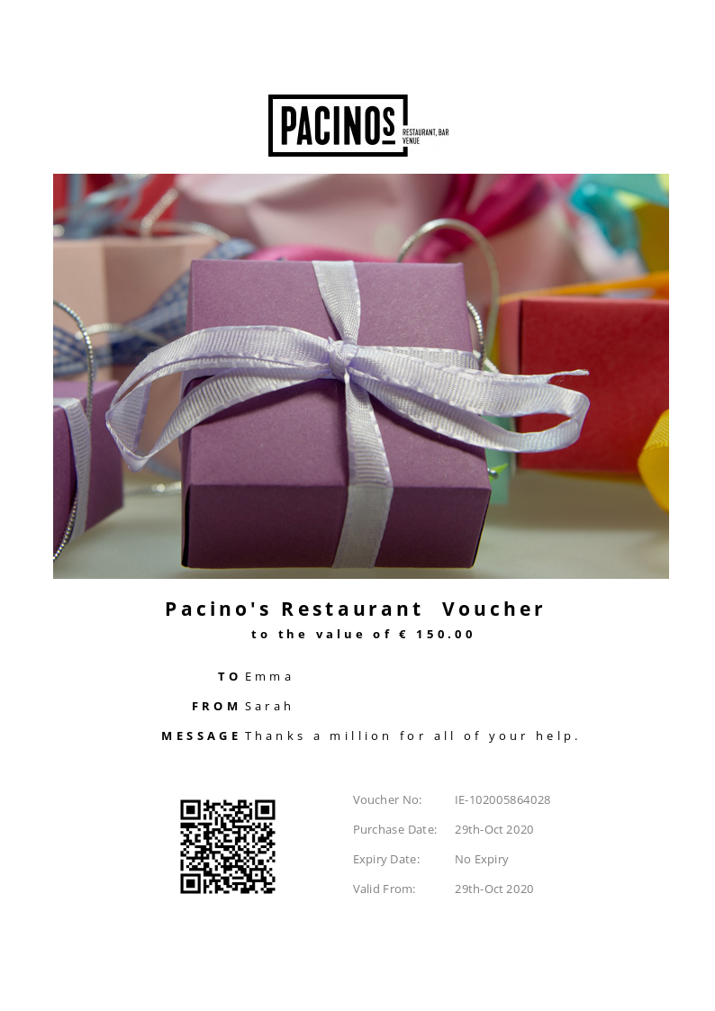 Pacino's Restaurant allows you to purchase instantly printable gift vouchers, special offers and tickets using the Voucher Connect platform.